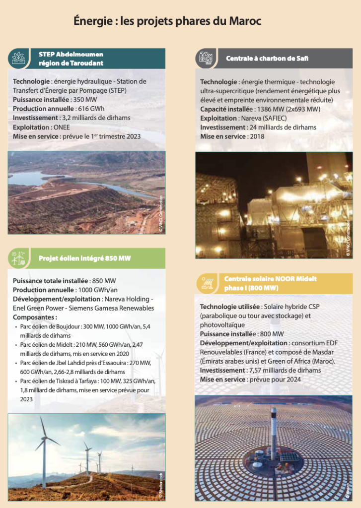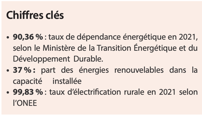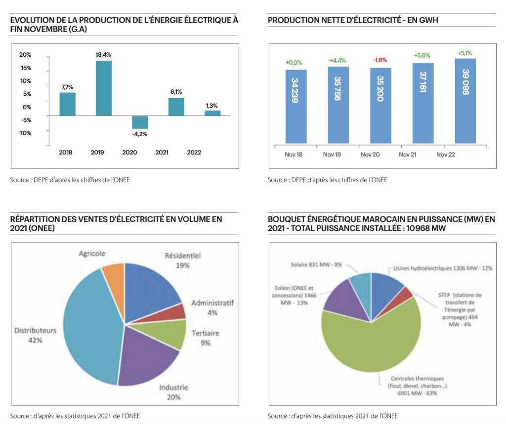 Fin novembre 2022, d’après les notes de conjoncture de la Direction des Études et des Prévisions Financières (DEPF) du Ministère de l’Économie et des Finances, la production locale d’électricité avait progressé de 1,5 % contre 6,3 % un an auparavant. Cette évolution couvre une hausse de 19,2 % de la production de l’Office National de l’Électricité et de l’Eau potable (ONEE) et de 4,9 % de la production d’énergies renouvelables dans le cadre de l’autoproduction ainsi qu’une diminution de 4,2 % de la production concessionnelle. Le solde des échanges d’énergie s’est établi à +1303 GWh en raison de l’augmentation de 170 % des importations et du repli de 40,5 % des exportations.
