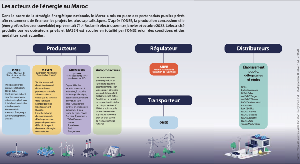 Le secteur de l’électricité au Maroc a été libéralisé à partir de 1994, à travers la mise en place de Partenariats Public-Privé (PPP) avec des opérateurs nationaux et internationaux. Depuis 2009, afin d’encourager et faciliter le développement des énergies renouvelables, le Maroc a modifié son cadre légal et a ouvert le marché de l’énergie aux acteurs privés. La loi 13-09 relative aux énergies renouvelables permet à un producteur privé d’électricité, exclusivement de source renouvelable, de vendre son productible à des usagers privés, dans le cadre d’un contrat d’achat d’électricité tripartite (producteur, client, ONEE), desservi par le réseau national en très haute tension (THT), haute tension (HT), et en moyenne tension (MT). Grâce à cette mesure, les industries les plus énergivores telles que la sidérurgie, la cimenterie, les mines ont pu bénéficier de tarifs plus attractifs.